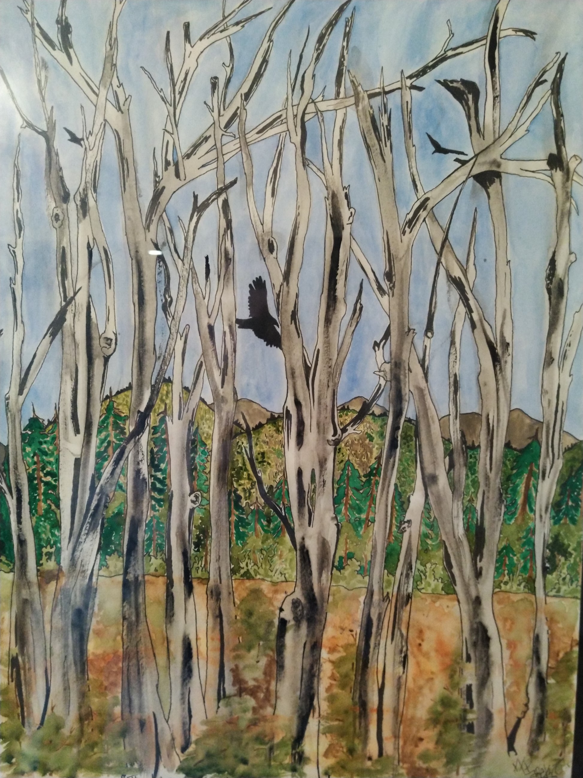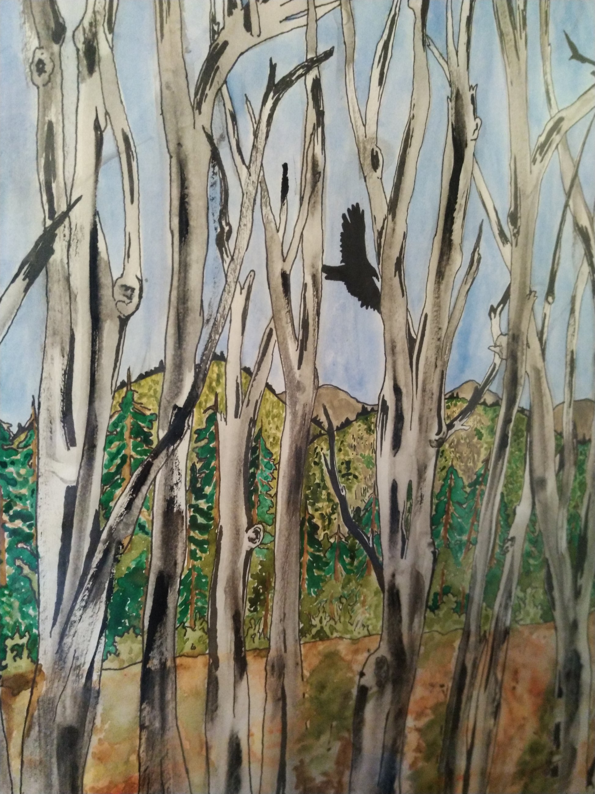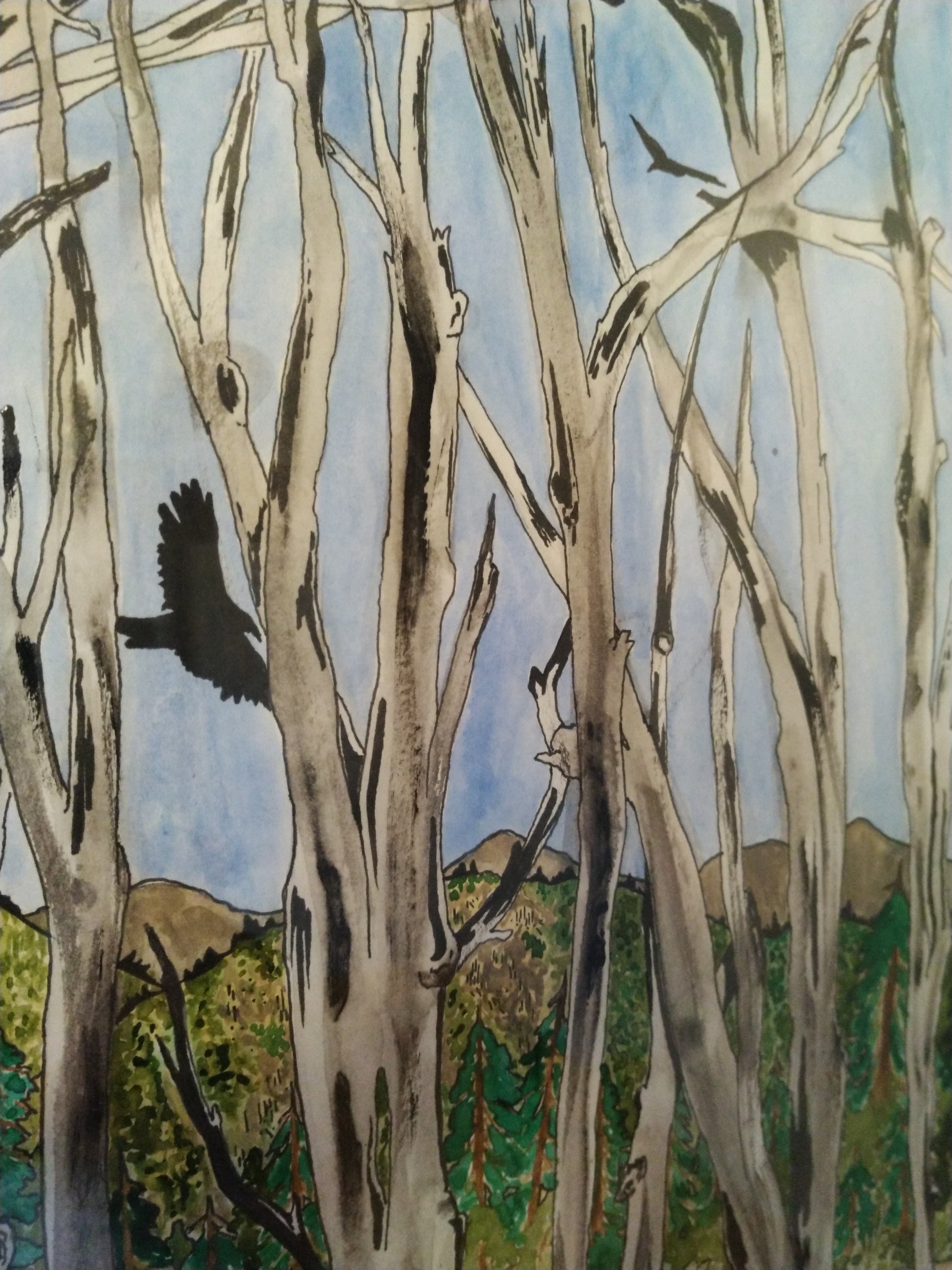 This is a painting done in Watercolor and ink. It shows old Aspen trees that were recently burned in a fire, with 3 vultures circling above the new growth of the field below. The name (Ashes Of Our Elders) stands for the singular organism which is the Aspen tree(s) succumbing to the flames but forever standing to tell their story.