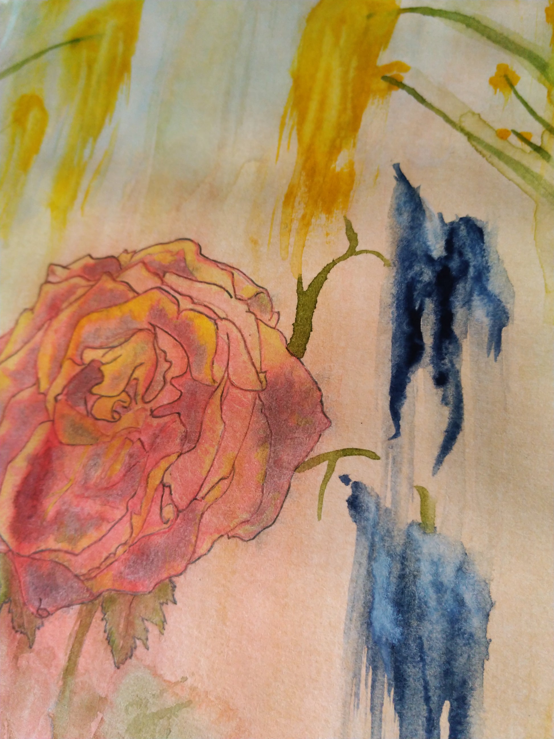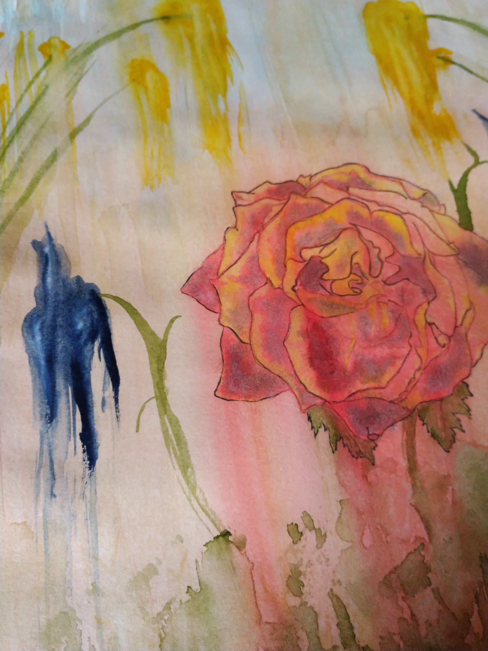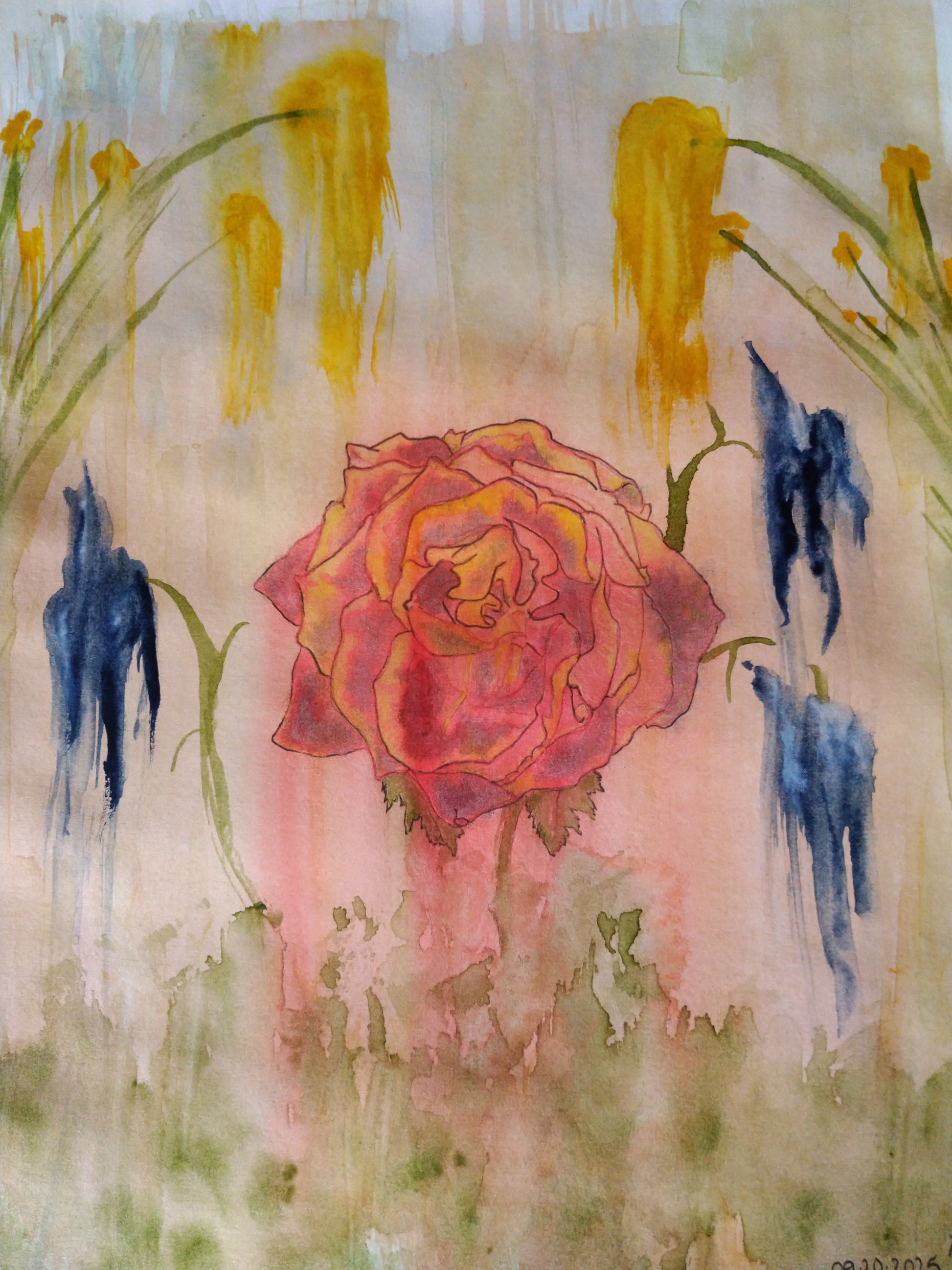 A watercolor done in Watercolor paint and watercolor pencil and wet brushed to give a blurred appearance to everything but the rose in center focus.