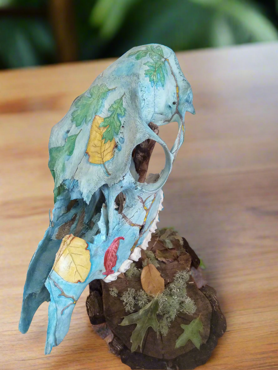 This piece is made from ethically sourced bone/ skull and would from The Rogue Valley in Southern Oregon. Hand painted in Watercolor in a subtle theme of fall colors. With butterflies on the back of the skull as a finishing touch to the leaves and Oak branches painted along the entirety of the skull. The cow skull also sits on a handmade wooden stand with real moss and leaves.