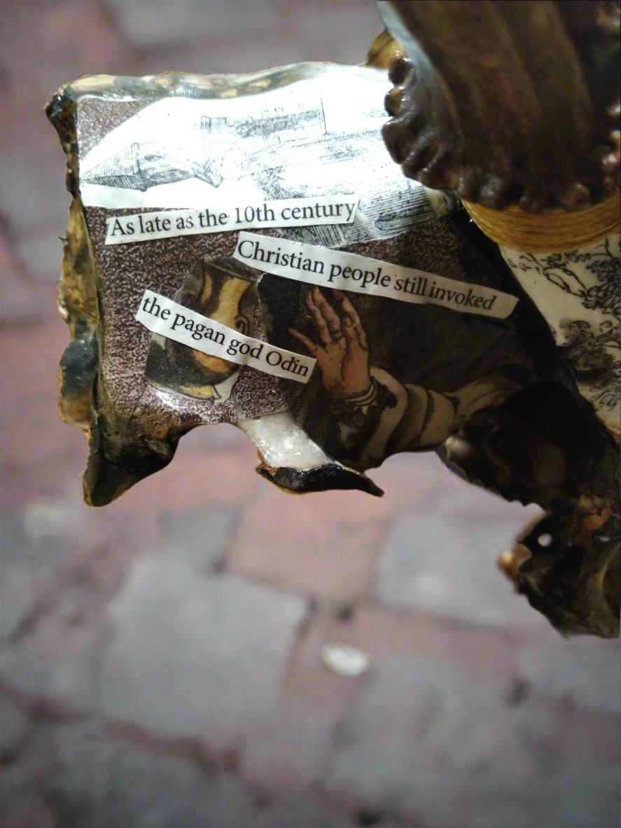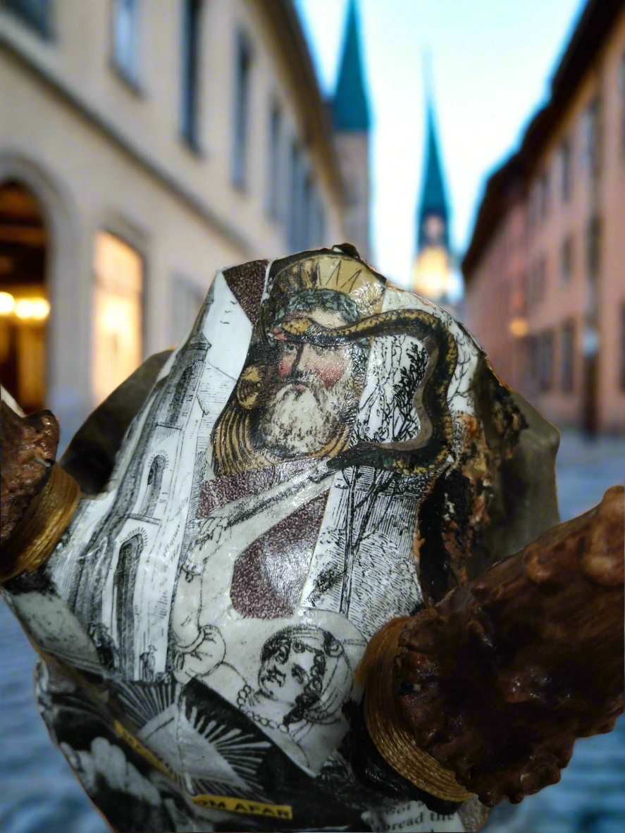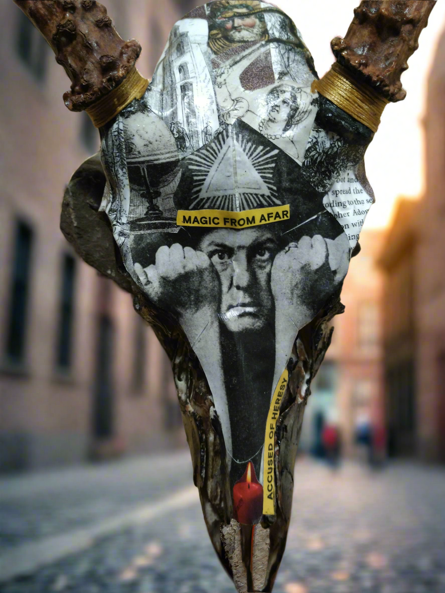 This piece was made of an ethically fallen deer, in which I took the skull, clean it, and then burned it in a fire for 8 hrs. Scrubbed and bleached the top side of the skull while leaving the char on the base. Then added imagery of A. Crowley, churches, priests, snakes and verbage to the cranial region. The antlers were stained in a chocolate leather stain, and the basin of the antlers was wrapped in a bronze threading. Finished in a matte varnish to seal it all together.