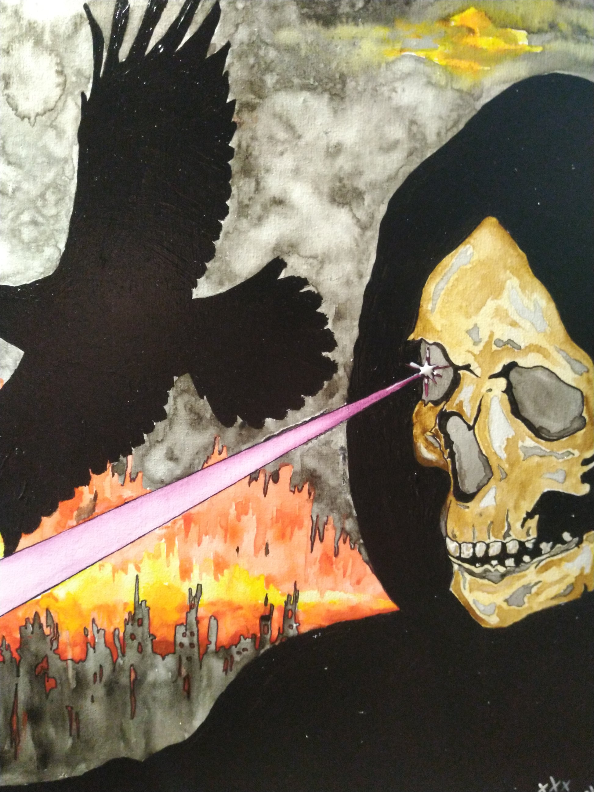 This painting was inspired by the darkness that surrounds us in this current day an age. (To the right in the painting) is a representation of the end of our worls as we know it with (Death) standing in front of a burning metropolis with his eye beaming a deep purple hue of energy down upon us, while the smoke covered sun and a lone crow soar high above the ashes in the sky. (On the left of the painting) Is (Death's) black skeletonized hand shooting a white beam of light into the red hued sky, with the feathers of his crows swirling upward beside another which rests on a branch of one of the burnt trees.